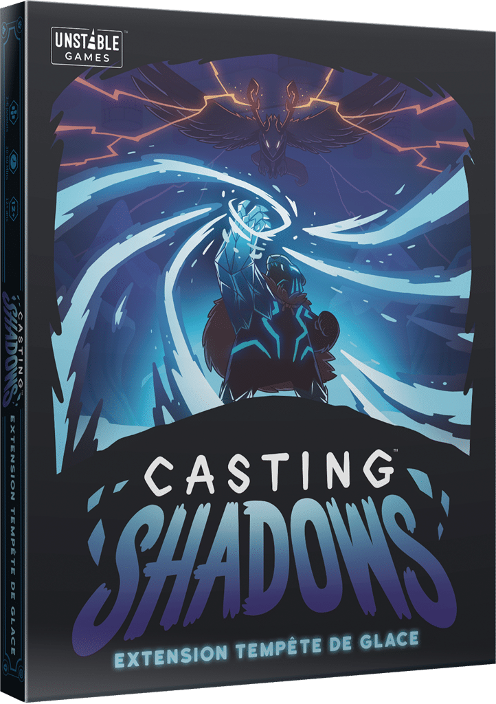Cette première extension pour Casting Shadows ajoute 2 nouveaux Personnages, 3 nouvelles tuiles Lieu et 34 cartes à vos parties, ce qui vous permettra d’y convier jusqu’à 6 joueurs et d’évoluer sur un Territoire plus grand. Grâce à cette extension, vos ennemis se retrouveront Transis et Assommés : leurs déplacements et leurs réserves de Ressources seront limités. Cette nouvelle magie vous mènera-t-elle à la victoire ou signera-t-elle votre défaite ?