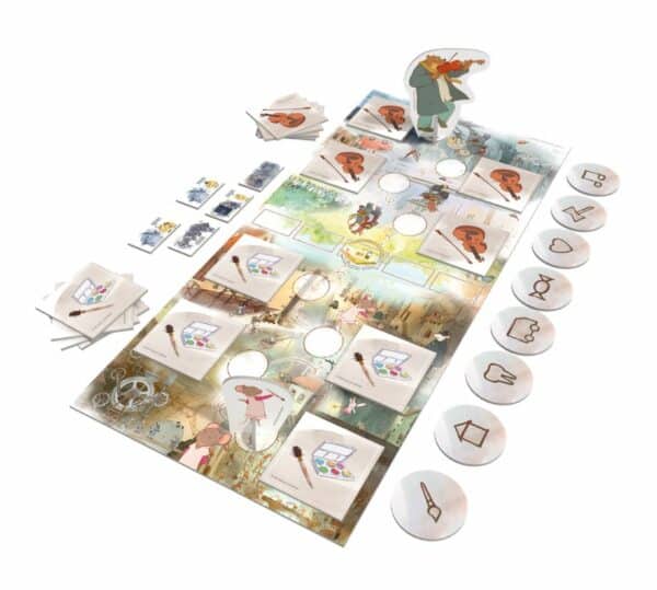 1 livret de règles, 1 plateau de jeu, des figurines d’Ernest et Célestine en carton, 8 tuiles Ernest, 8 tuiles Célestine, 5 jetons Police, 8 jetons Symbole.