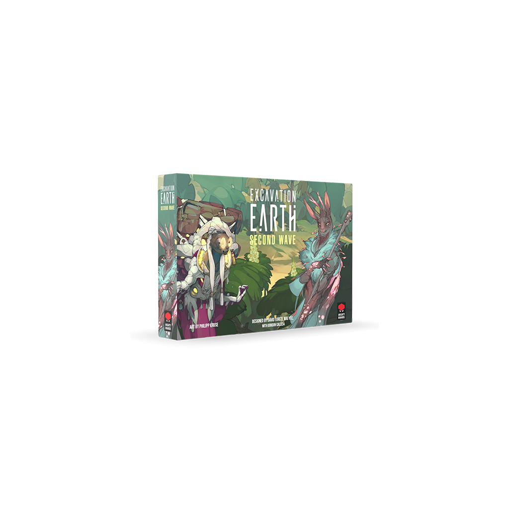 Deuxième vague est la première extension d’Excavation Earth. Elle introduit deux nouvelles races – les Collectionneurs et les Influenceurs – ainsi que de nouveaux éléments de jeu et de nouvelles façons de marquer des points. La barge d’observation, qui vous permet de manipuler davantage la demande du marché pour les artefacts et de marquer des points à la fin du jeu. Les objectifs ajoutent une toute nouvelle façon de marquer des points en remplissant des missions déterminées et les Racial Wildcards donnent à chaque race sa propre carte d’action, plus puissante, pour booster son tour !