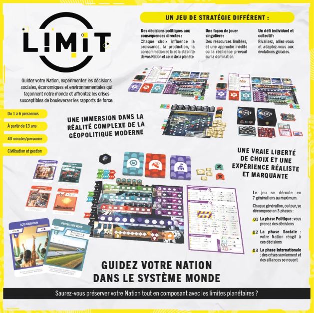 Limit est un jeu de civilisation et de gestion compétitif. Incarnez une Nation confrontée aux défis de l’histoire de notre monde. Prenez des décisions politiques cruciales, gérez le stock limité de ressources, anticipez les crises mondiales et adaptez-vous aux bouleversements de la planète ainsi qu’aux décisions des autres Nations.