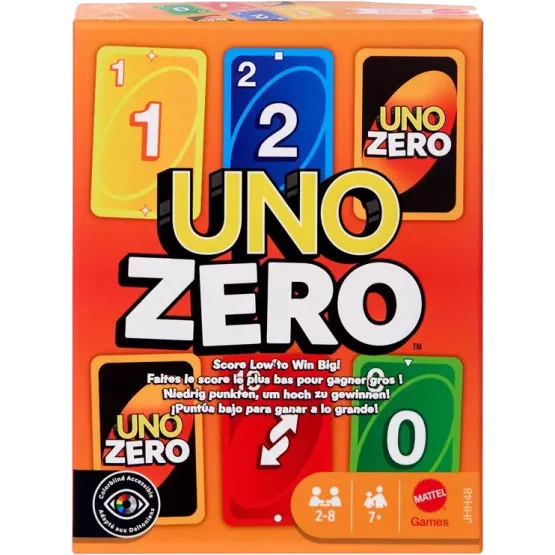 L’objectif est d’obtenir le score le plus bas possible, en visant le zéro absolu ! Au lieu de garder leurs cartes dans leur main, les joueurs commencent la partie en les disposant face cachée en une grille de deux rangées de trois cartes. Ils échangent ensuite des cartes de forte valeur contre des cartes de faible valeur afin de déjouer leurs adversaires et obtenir un score faible. Jusqu’où pourront-ils descendre ? Des symboles graphiques ajoutés à chaque carte permettent d’en identifier la ou les couleurs afin que les joueurs atteints d’une quelconque forme de daltonisme puissent jouer. Et les cartes Action, comme les cartes Inversion et Passer, peuvent renverser le jeu. UNO Zero est un jeu qui mélange bonne humeur et esprit tactique pour des parties de 2 à 8 joueurs à partir de 7 ans. Il est idéal pour les parties en famille ou entre amis ! Les couleurs et les décorations peuvent varier.