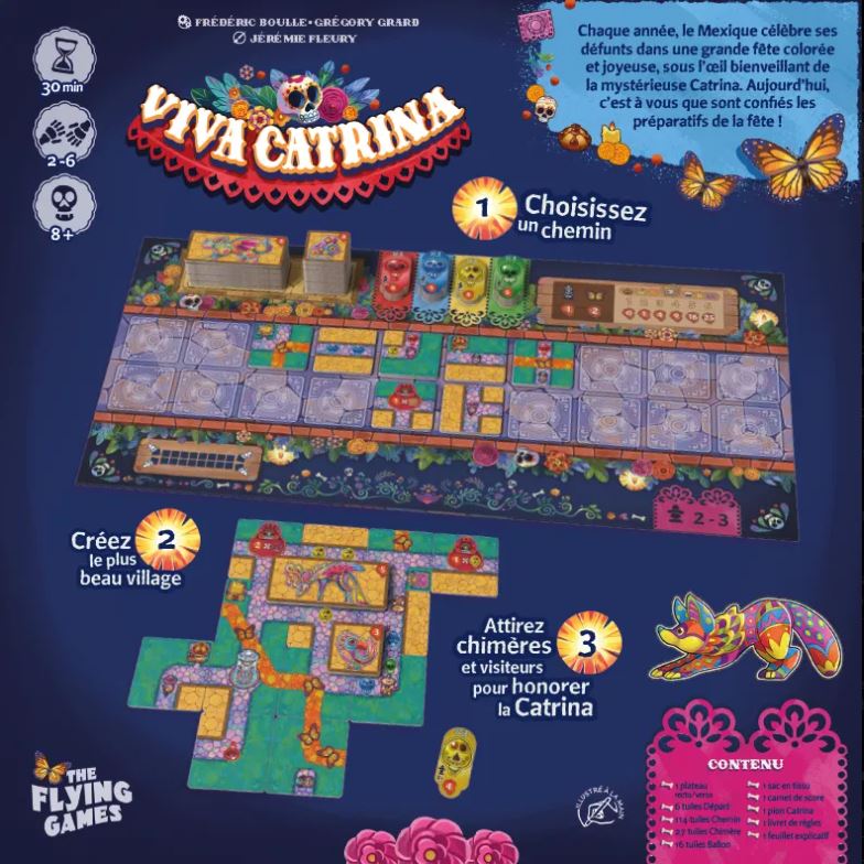 Viva Catrina propose une expérience de placement stratégique où chaque tuile posée façonne l’évolution de votre Village. À chaque tour, vous devez choisir avec soin parmi les tuiles disponibles, créer des chemins pour relier papillons et visiteurs, ériger des socles pour attirer des chimères, et organiser des envolées de ballons pour maximiser vos points. La construction optimisée d’un réseau connecté est essentielle : une mauvaise pose pourrait couper vos chemins ou rendre vos objectifs inatteignables. L’interaction indirecte, via la course aux chimères ou aux tuiles ballons, ajoute une tension légère mais constante. Le rythme est fluide et la satisfaction vient de voir son Village grandir et s’animer tout au long de la partie.